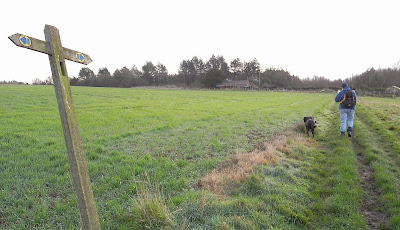 Walking round two sides of the third field, we ignored a boggy stile in the first corner, at a junction with another footpath, and proceeded to the next corner to negotiate a slightly less wet stile. The field was obviously used for sheep, and so was well fenced. This meant it was a little tricky finding a way through for the dogs as the adjacent gate was unfortunately padlocked.